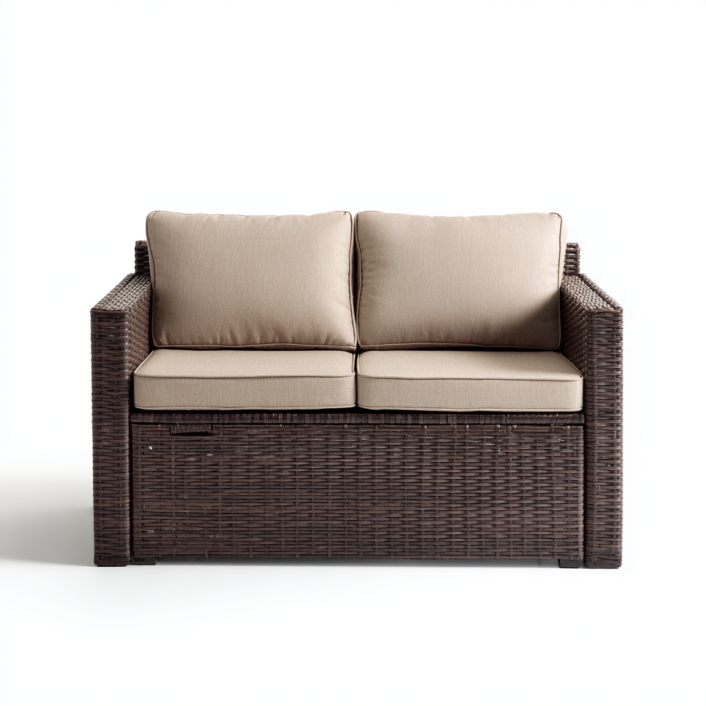 Sofa ogrodowa z technorattanu 132x75x82 cm - brązowa z jasnobrązowymi poduszkami - z pojemnikiem do przechowywania - styl nowoczesny - odpowiednia do ogrodu i tarasu
