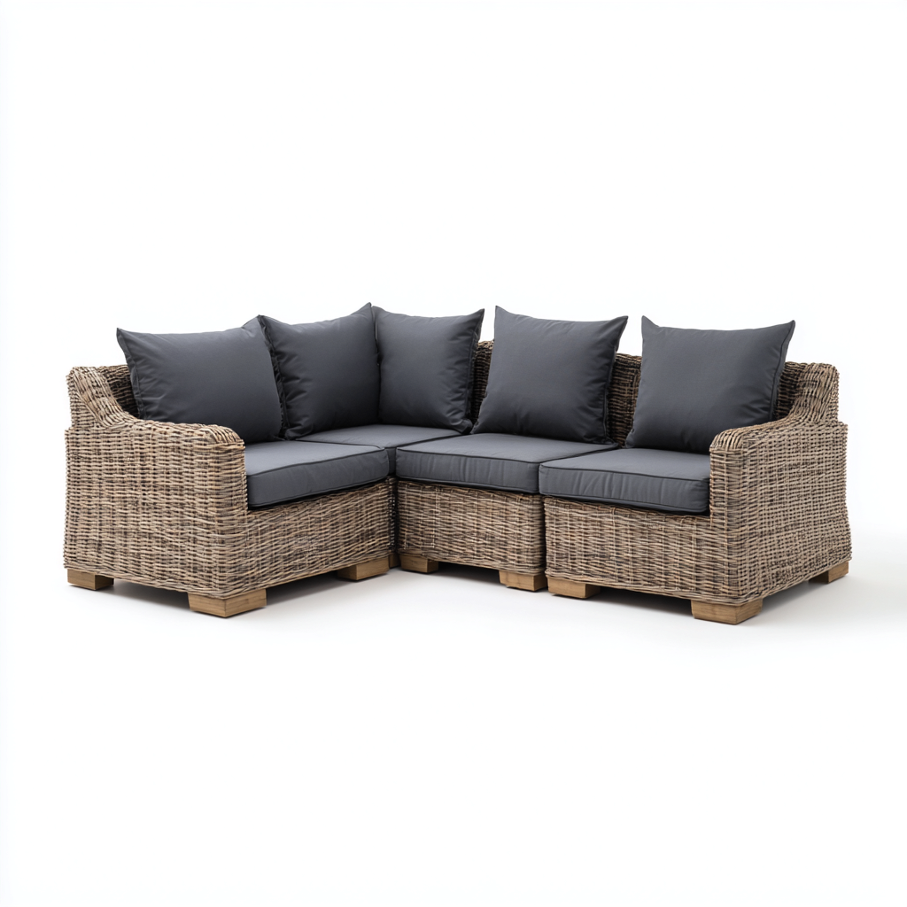 Sofa narożna ogrodowa z technorattanu 220x160x80 cm - naturalny rattan z ciemnoszarymi poduszkami - styl klasyczny nowoczesny - odpowiednia do ogrodu i tarasu