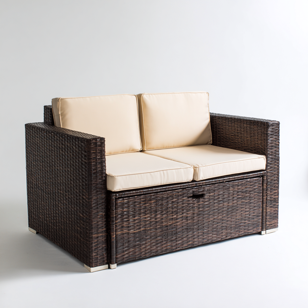 Sofa ogrodowa z technorattanu 130x72x82 cm - brązowa z beżowymi poduszkami - z pojemnikiem do przechowywania - styl nowoczesny - odpowiednia do ogrodu i tarasu