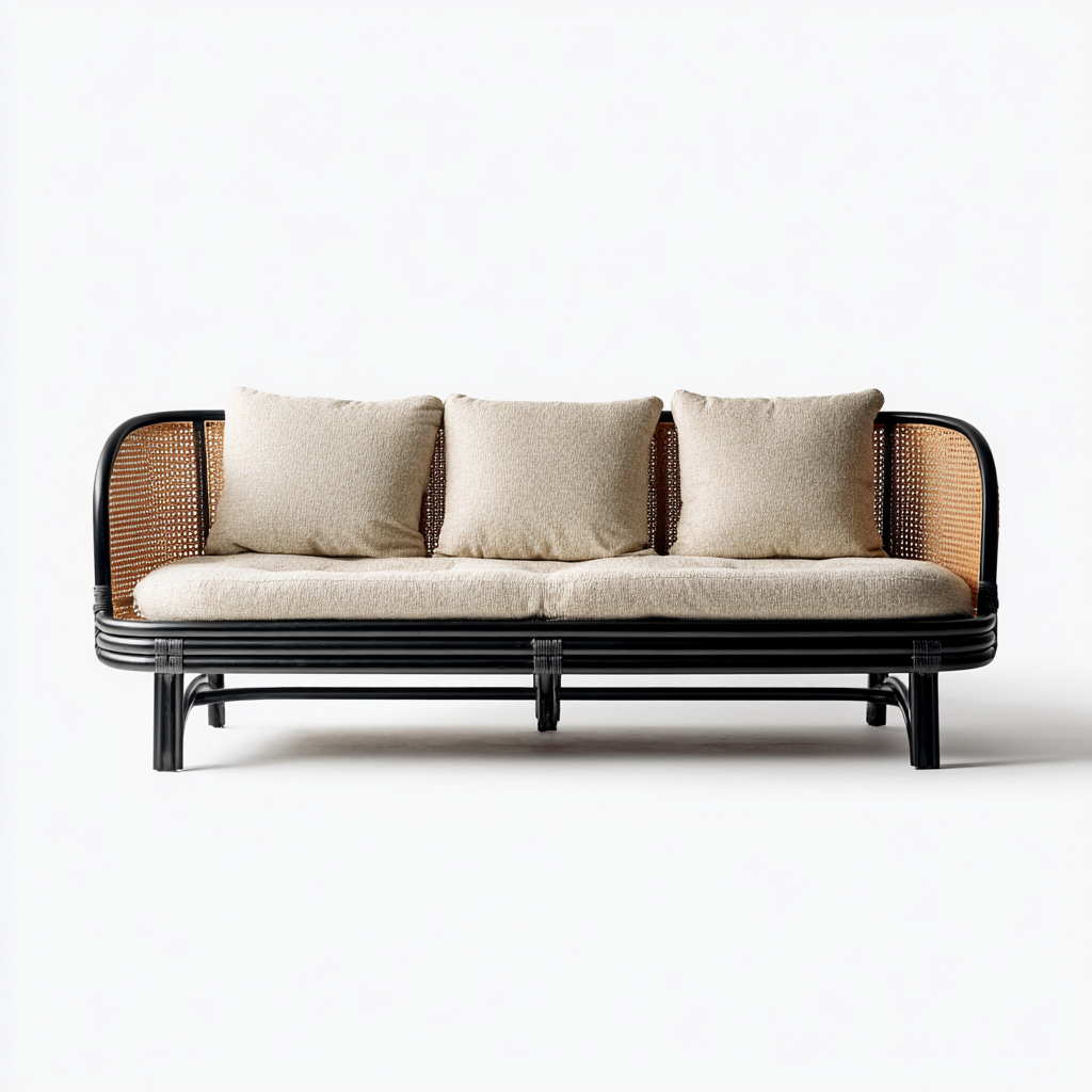 Sofa ogrodowa z rattanu i metalu 175x80x82 cm - czarna rama z beżowymi poduszkami - styl skandynawski - odpowiednia do ogrodu i tarasu