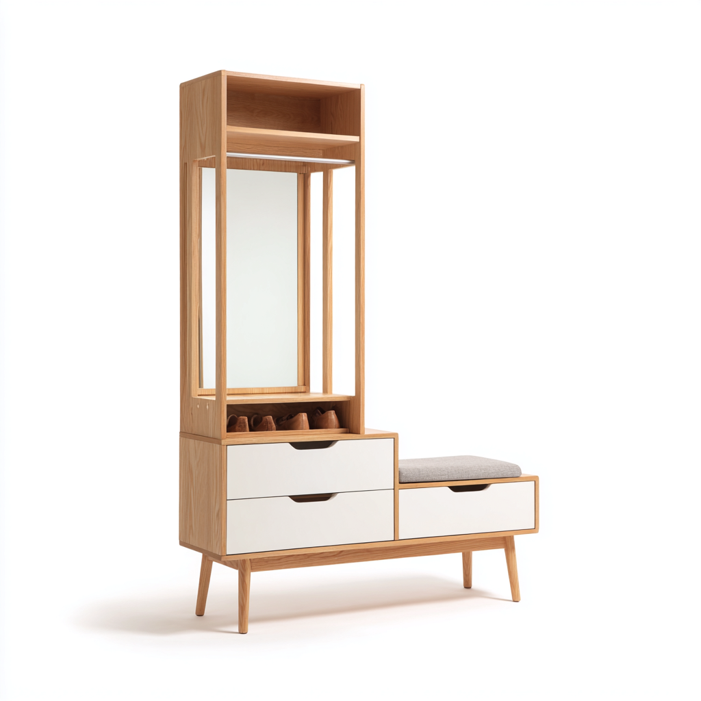 Wieszak na ubrania z lustrem z drewna i płyty MDF 100x40x180 cm - dąb naturalny - biały - styl nowoczesny - idealny do przedpokoju