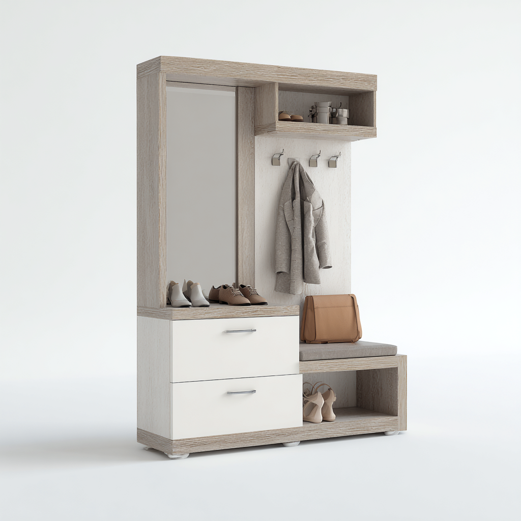 Wieszak na ubrania z lustrem i siedziskiem z płyty MDF 100x40x180 cm - dąb sonoma - biały - styl nowoczesny - idealny do przedpokoju
