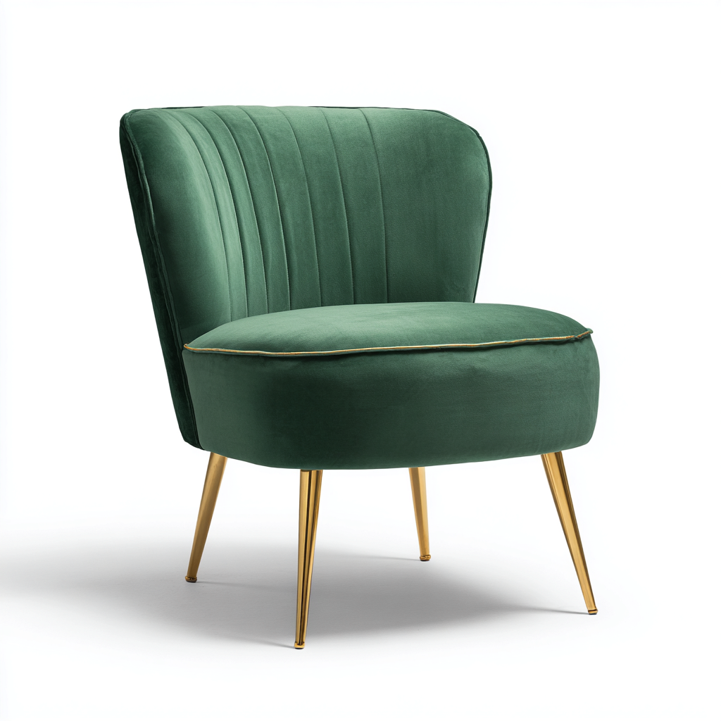 Stylowy fotel tapicerowany w kolorze butelkowozielonym to połączenie elegancji i komfortu. Zaokrąglone oparcie z pionowymi przeszyciami oraz smukłe złote nogi nadają mu luksusowy charakter, idealny do salonu w stylu glamour.