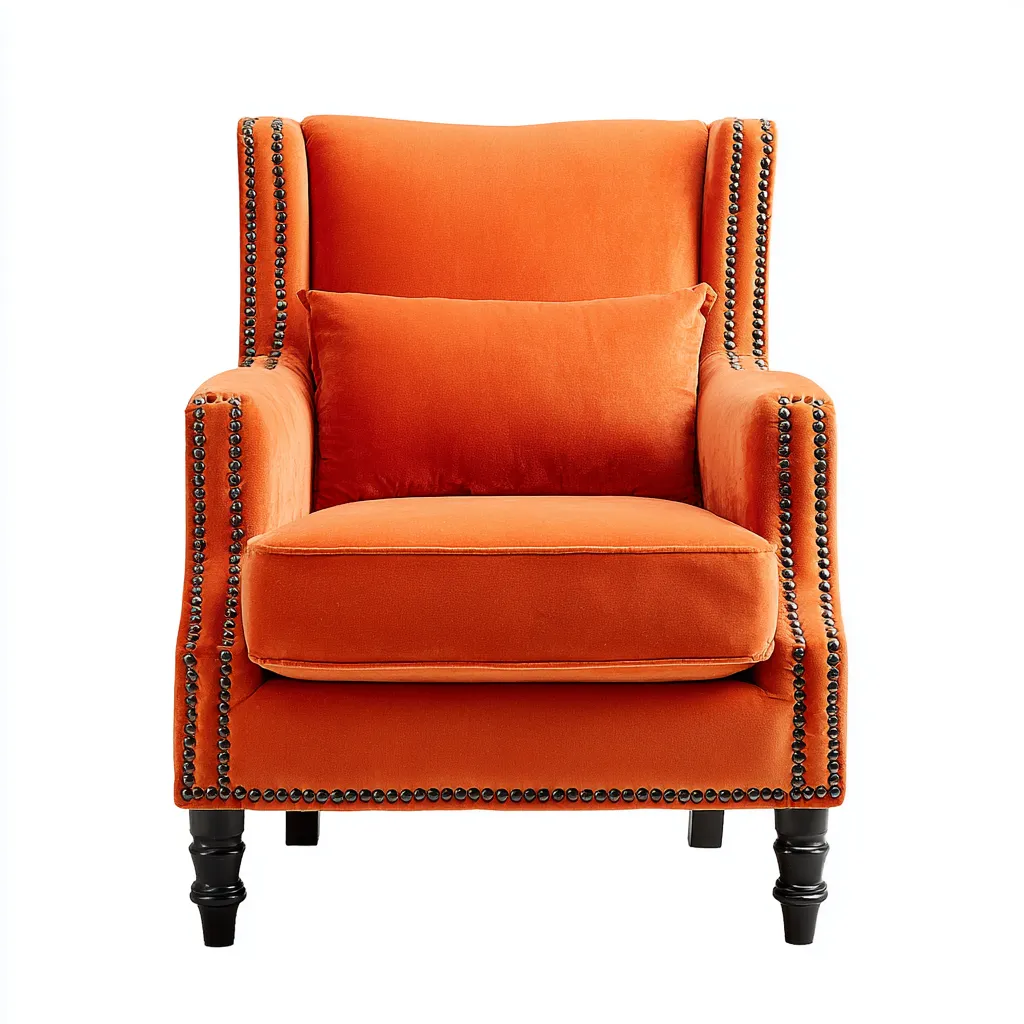 Ten elegancki fotel tapicerowany w kolorze pomarańczowym to wyjątkowe połączenie luksusu i wygody. Pikowana konstrukcja z ozdobnymi gwoździami oraz klasyczny kształt nadają mu ponadczasowy charakter, idealny do salonu lub pokoju dziennego.