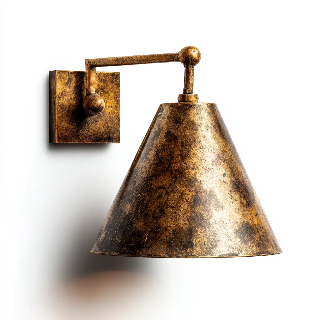 Industrialny kinkiet ścienny wykonany z metalu w złotym wykończeniu o postarzonej fakturze. Prosty, stożkowy klosz oraz solidne ramię montażowe nadają lampie minimalistyczny, a zarazem surowy charakter, idealny do wnętrz loftowych, salonów oraz korytarzy.