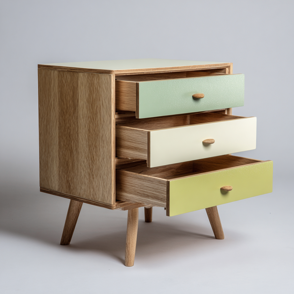 Korpus komody wykonany z litego drewna dębowego o naturalnym wykończeniu. Fronty szuflad pokryte lakierem w odcieniach zielonym i jasnokremowym. Drewniane uchwyty i nogi dodają trwałości oraz podkreślają naturalny charakter mebla.