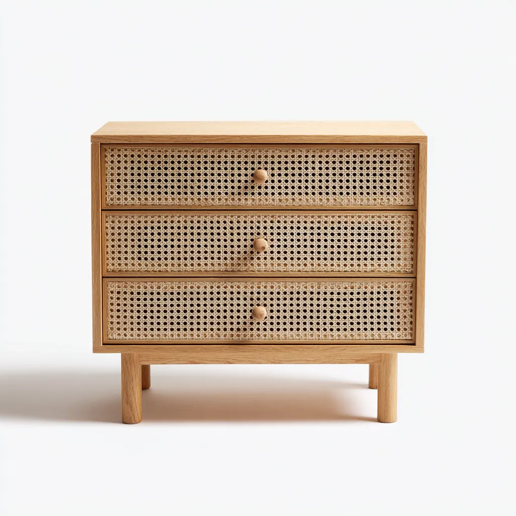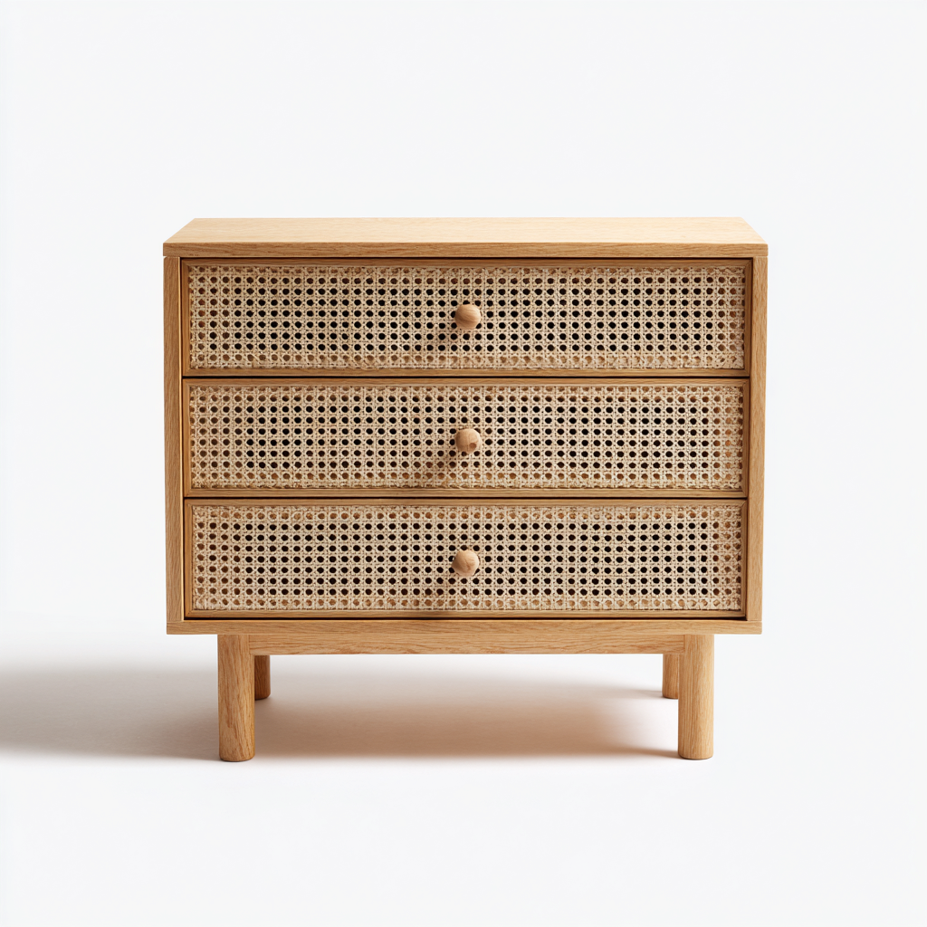 Korpus wykonany z litego drewna w jasnym, naturalnym kolorze, natomiast fronty szuflad z ręcznie plecionego rattanu. Uchwyt w formie drewnianego pokrętła zapewnia wygodę użytkowania i spójność estetyczną. Całość pokryta ekologicznym lakierem matowym.