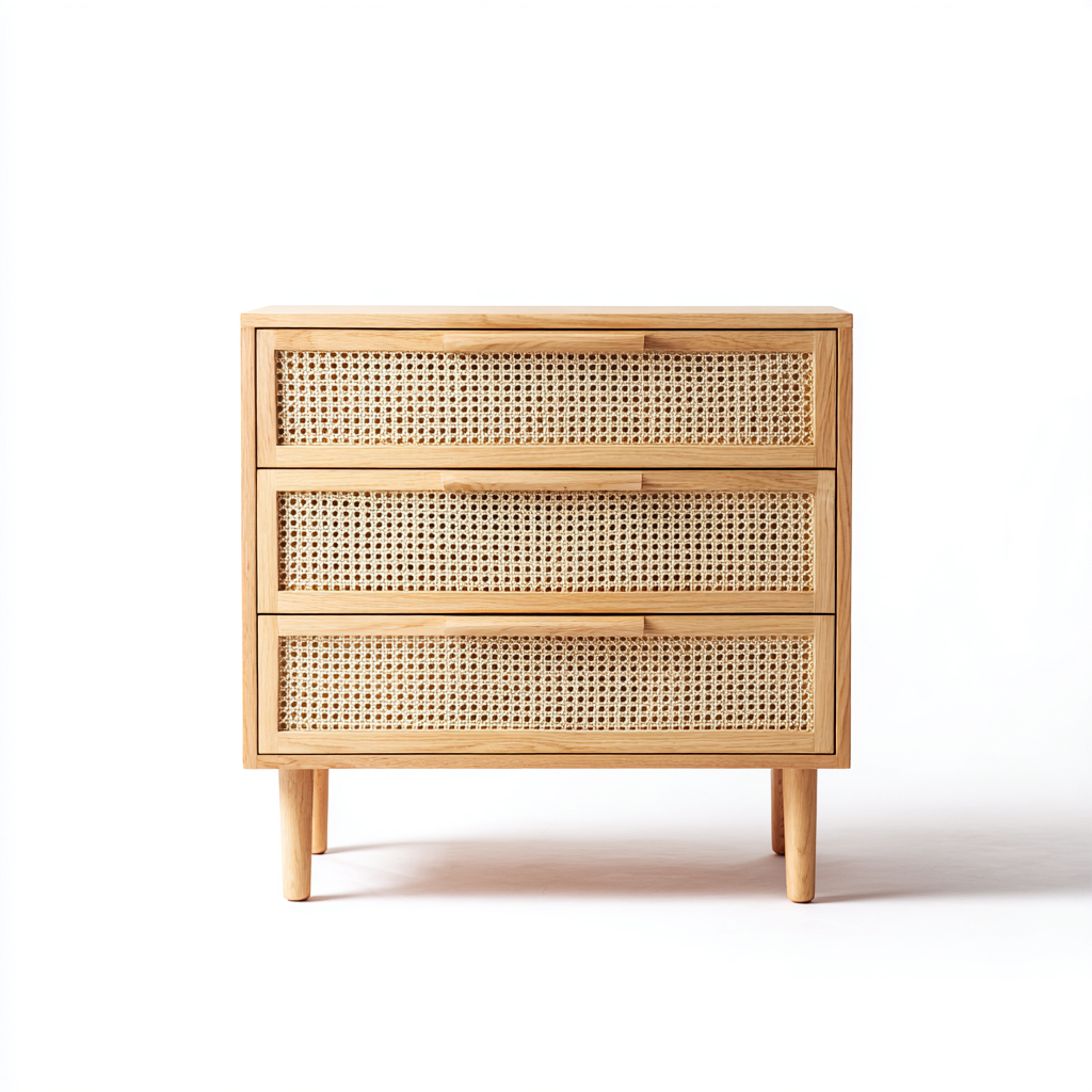 Korpus komody wykonany z litego drewna w naturalnym odcieniu, a fronty szuflad z ręcznie plecionego rattanu o delikatnej strukturze. Całość wykończona matowym lakierem chroniącym powierzchnię i podkreślającym naturalne piękno drewna.