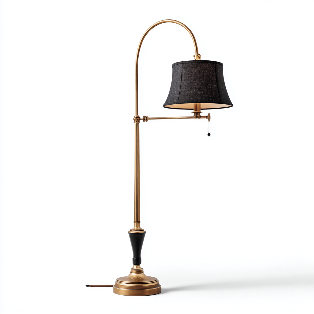 Lampa wykonana z metalu w czarnym wykończeniu, z abażurem z tkaniny o subtelnej fakturze. Stabilna, ciężka podstawa gwarantuje bezpieczeństwo użytkowania. Zakrzywione ramię i dekoracyjny trzon podkreślają jej klasyczny charakter.