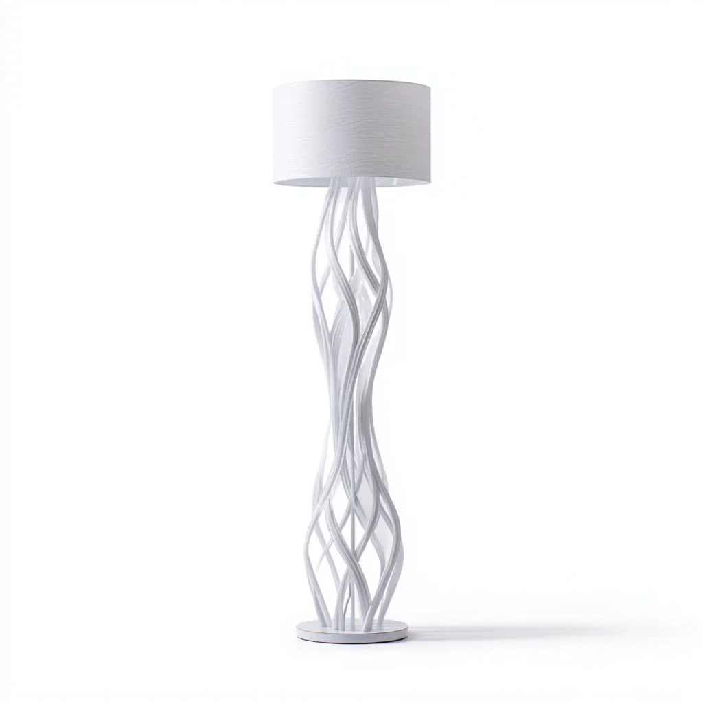 Nowoczesna lampa podłogowa o rzeźbiarskiej formie w całości utrzymana w białej tonacji to elegancki element wystroju, który łączy funkcjonalność z artystycznym charakterem. Jej konstrukcja z finezyjnie splecionych prętów nadaje wnętrzu lekkości i wyrafinowania, idealna do salonu lub sypialni.