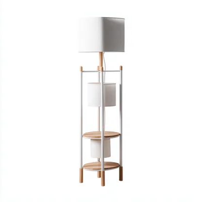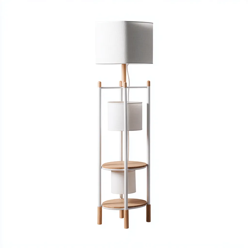 Stylowa lampa podłogowa z półkami w stylu skandynawskim łączy naturalne drewno i biały metal, tworząc harmonijną kompozycję idealną do nowoczesnych i przytulnych wnętrz. Doskonale sprawdzi się w salonie, sypialni lub biurze jako źródło światła i element dekoracyjny.