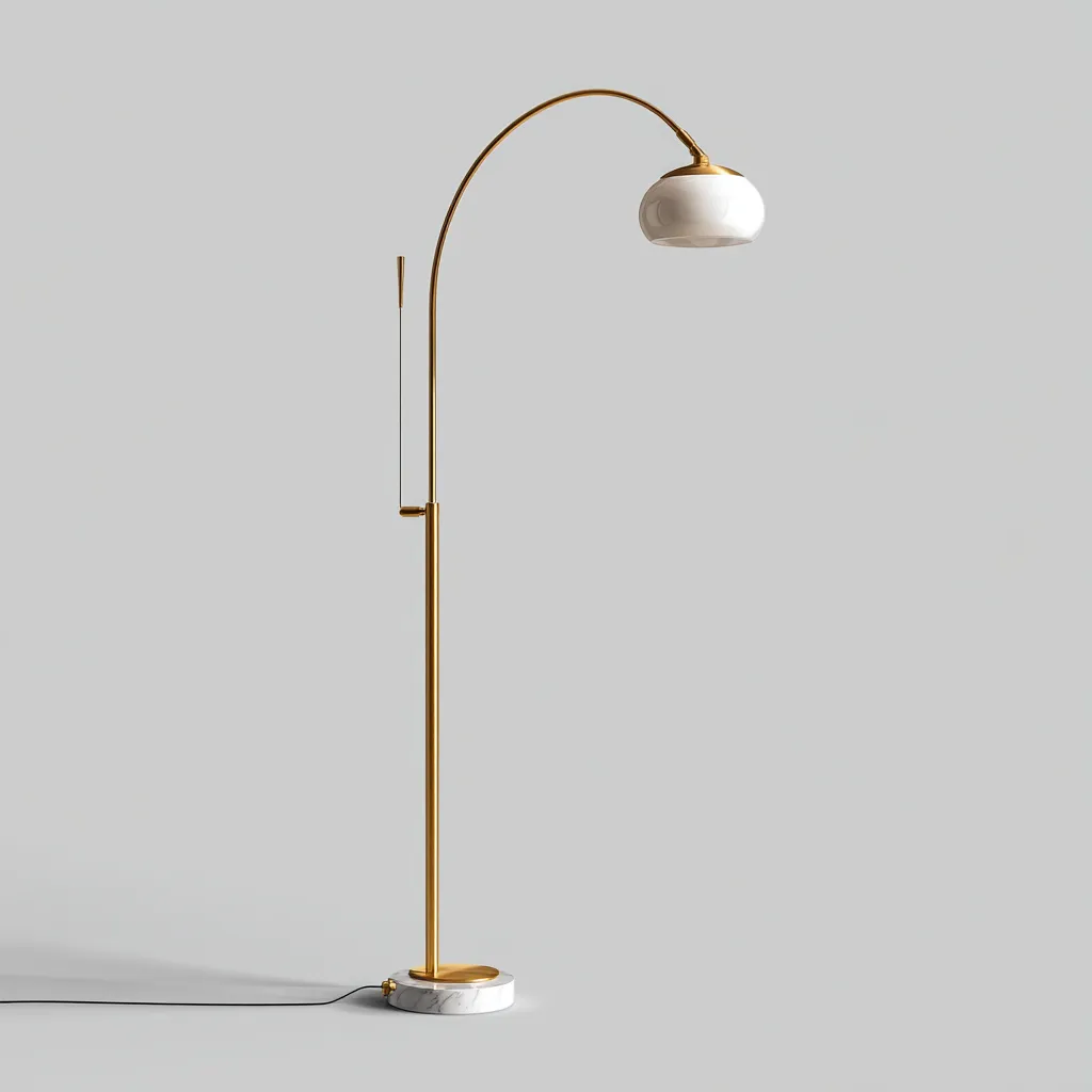 Elegancka lampa podłogowa w stylu nowoczesnym łączy w sobie luksusowy design i funkcjonalność. Złote wykończenie metalu w połączeniu z białym marmurowym kloszem i podstawą dodaje wnętrzu klasy i subtelnego blasku, idealnie komponując się z wystrojem salonu lub sypialni.