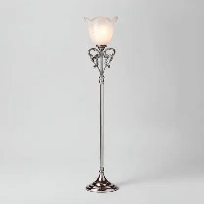 Elegancka lampa podłogowa w stylu klasycznym to doskonały wybór dla miłośników wyrafinowanego wzornictwa. Dzięki subtelnemu połączeniu metalu i szkła w kolorze srebrnym wprowadza do salonu atmosferę elegancji i ciepłego światła.