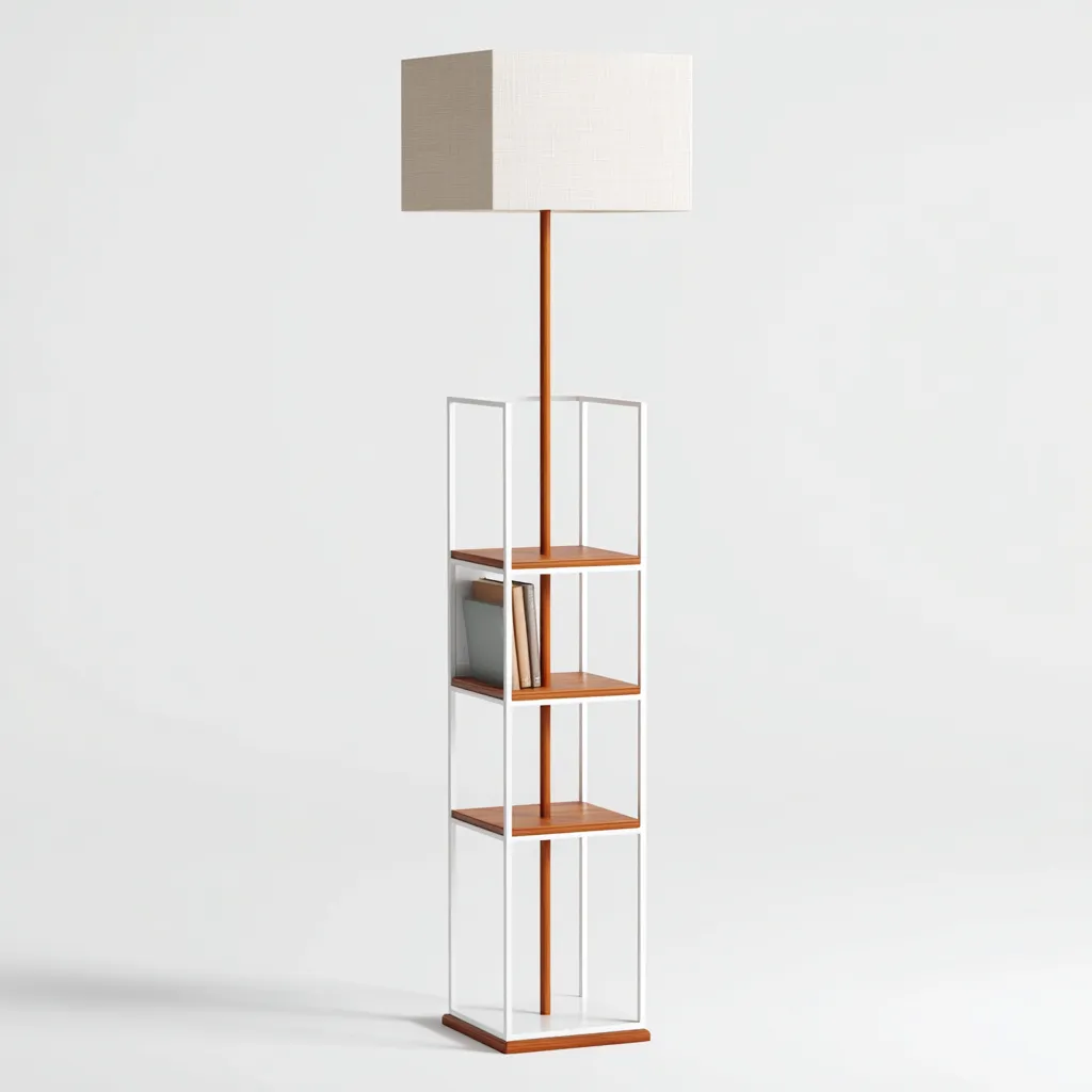 Nowoczesna lampa podłogowa z wbudowanymi półkami to praktyczne i stylowe rozwiązanie do salonu lub sypialni. Połączenie oświetlenia i przestrzeni do przechowywania sprawia, że doskonale komponuje się z nowoczesnymi i minimalistycznymi wnętrzami.