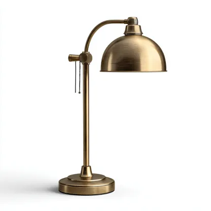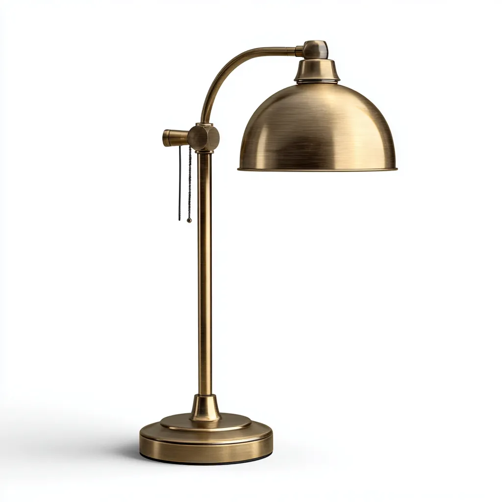 Elegancka metalowa lampa stołowa w kolorze mosiądzu, utrzymana w stylu vintage. Jej klasyczny design z półkolistym kloszem i stabilną podstawą doskonale łączy funkcjonalność z ponadczasową estetyką, idealnie komponując się z wystrojem biura, salonu lub gabinetu.