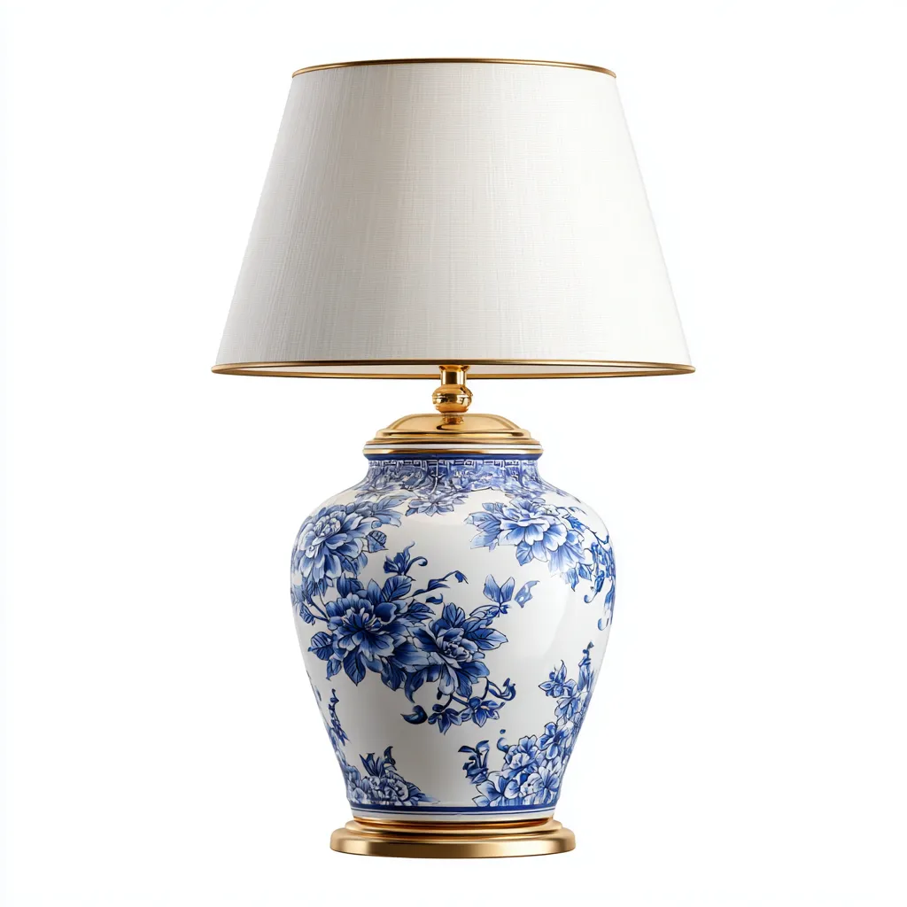 Elegancka lampa stołowa wykonana z porcelany w klasycznym biało-niebieskim kolorze, ozdobiona kwiatowym motywem w stylu orientalnym. To idealny dodatek do wnętrz urządzonych w duchu tradycji i harmonii, nadający pomieszczeniom wyjątkowy charakter.