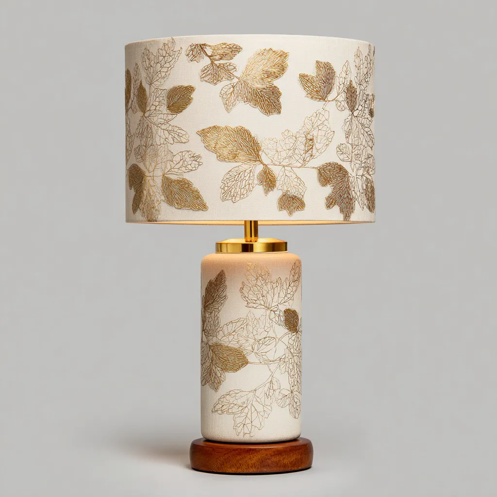 Elegancka lampa stołowa o ciepłym, naturalnym charakterze, łącząca kremowy odcień tkaniny z subtelnym złotym wzorem liści. Jej delikatne światło tworzy przytulną atmosferę, idealną do salonu, sypialni lub gabinetu.