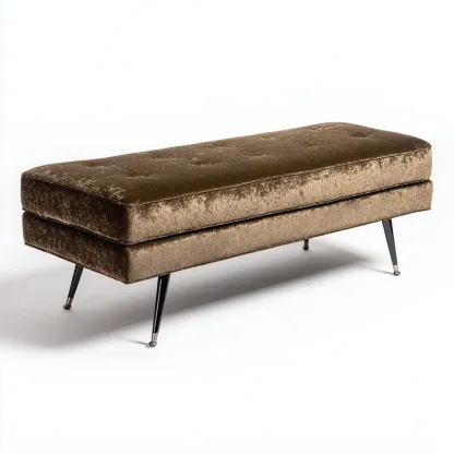 Stylowa ławka do przedpokoju inspirowana wzornictwem retro, tapicerowana miękkim aksamitem w eleganckim odcieniu złotobrązowym. Jej prosta, a zarazem wyrafinowana forma doskonale podkreśla charakter nowoczesnych oraz klasycznych wnętrz. Idealna do przedpokoju, sypialni lub salonu jako komfortowe siedzisko.