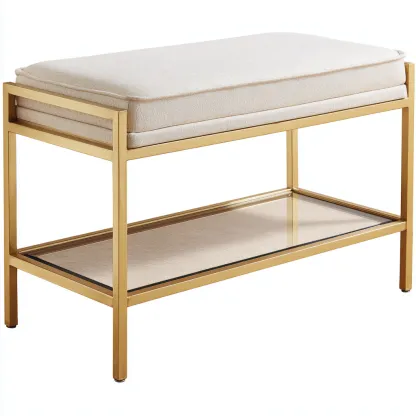 Konstrukcja ławki wykonana jest z trwałego metalu w kolorze złotym, który nadaje meblowi luksusowy charakter. Siedzisko obite zostało tkaniną w odcieniu beżowym, a dolna półka wykonana jest ze szkła hartowanego, co dodaje lekkości całej konstrukcji.