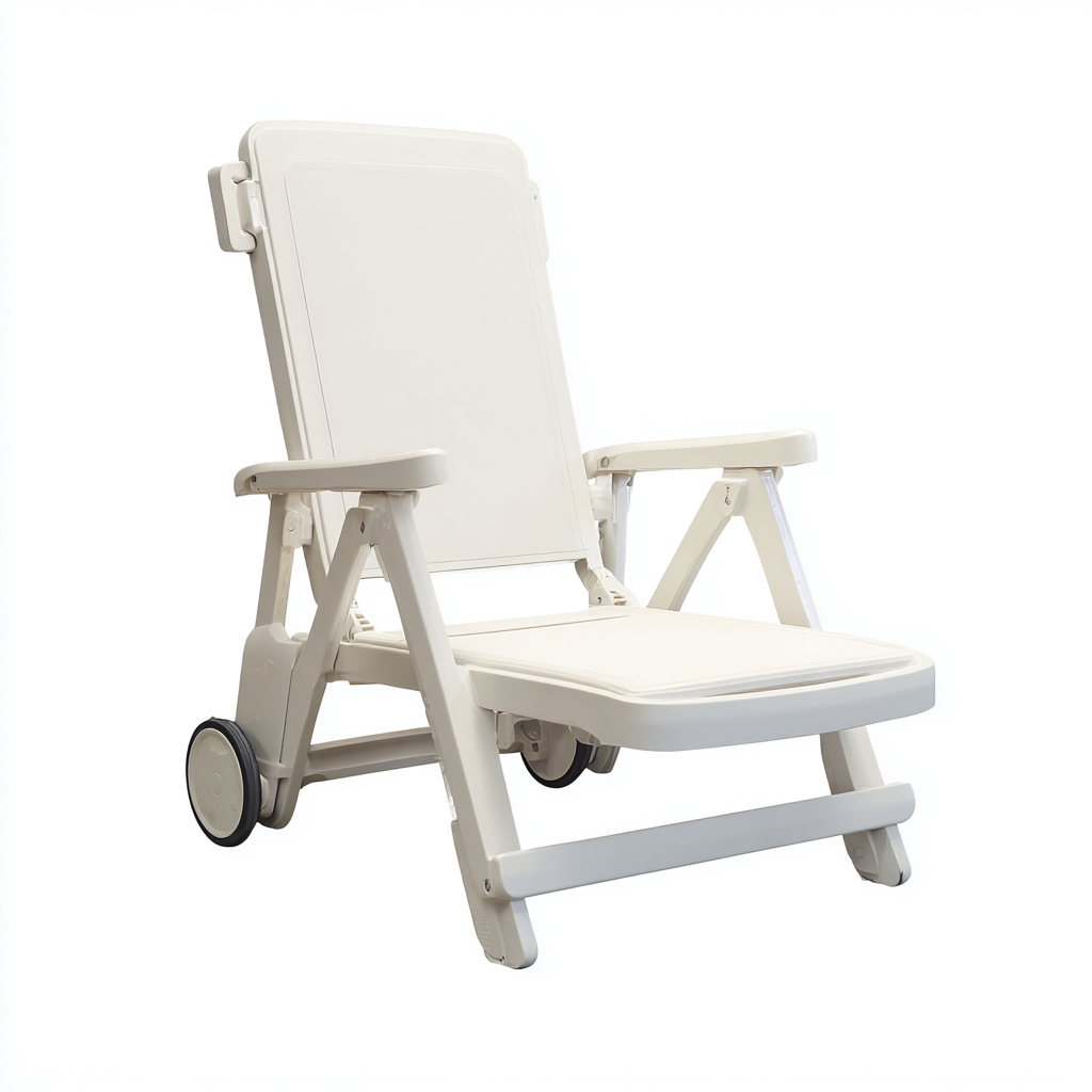 Składana konstrukcja ułatwia przechowywanie oraz transport. Regulowane oparcie pozwala dopasować pozycję do indywidualnych preferencji. Zintegrowane podłokietniki zapewniają dodatkowy komfort, a tylne kółka umożliwiają łatwe przesuwanie leżaka po powierzchni.