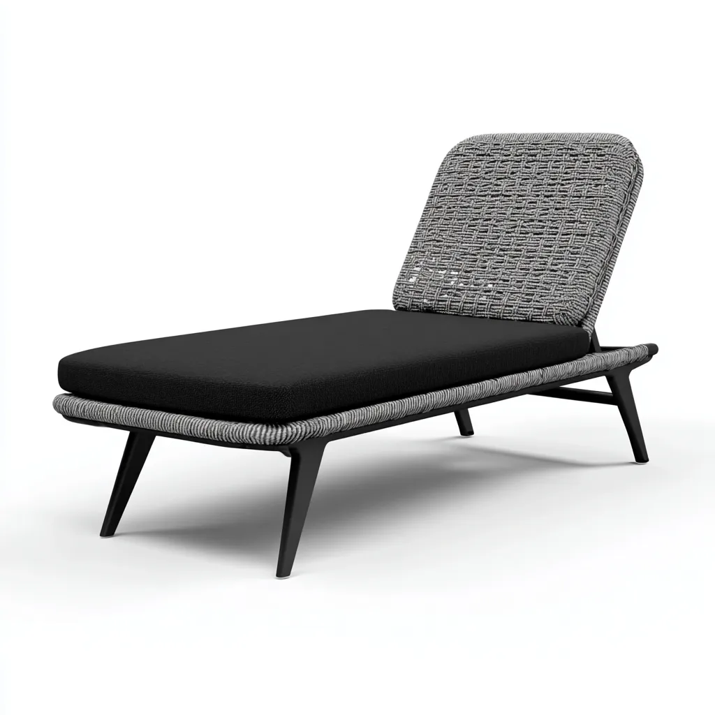 Elegancki leżak ogrodowy w nowoczesnym stylu, wykonany z technorattanu w odcieniach czerni i szarości. Doskonale sprawdzi się w ogrodzie, na tarasie lub przy basenie, zapewniając komfortowy wypoczynek na świeżym powietrzu.