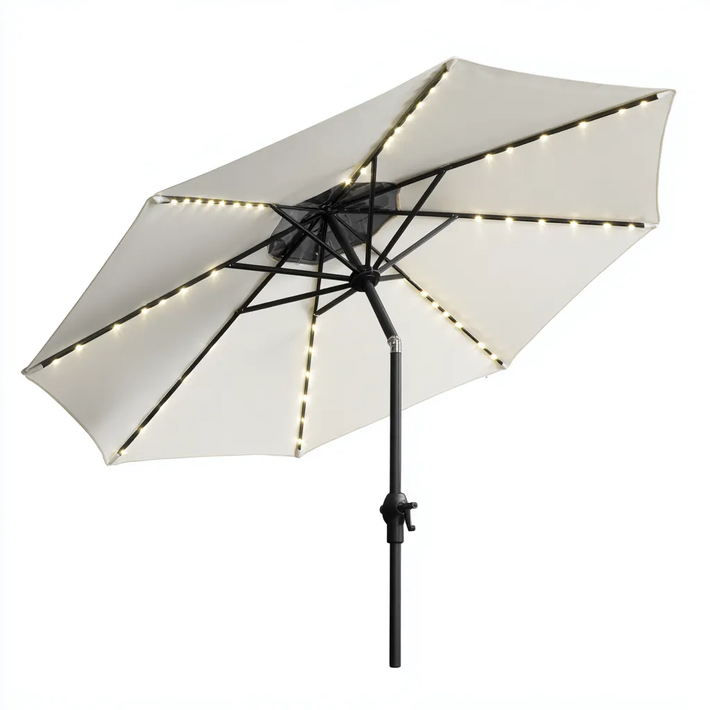 Nowoczesny parasol ogrodowy z oświetleniem LED to połączenie elegancji i praktyczności. Kremowy kolor tkaniny w połączeniu z czarną metalową konstrukcją nadaje mu stylowy i uniwersalny charakter. Idealny do ogrodu, na taras lub balkon, zapewnia cień w ciągu dnia i nastrojowe światło po zmroku.