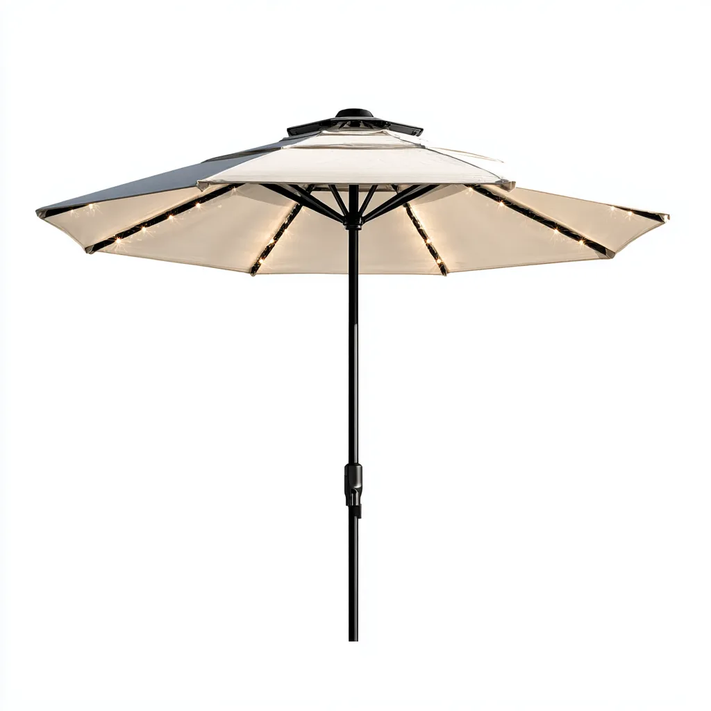 Posiada wbudowane oświetlenie LED zasilane energią słoneczną, które zapewnia subtelne światło po zmroku. Mechanizm korbowy ułatwia otwieranie i zamykanie parasola. Konstrukcja jest stabilna i odporna na działanie czynników zewnętrznych, idealna do użytku w ogrodzie lub na tarasie.