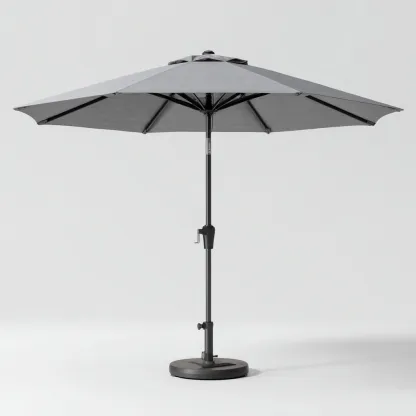 Parasol wykonany z wytrzymałej tkaniny poliestrowej odpornej na promieniowanie UV i wilgoć. Trwały metalowy trzon i stelaż malowany proszkowo zapewniają odporność na korozję i stabilność konstrukcji. Szara tkanina w neutralnym odcieniu nadaje całości elegancki wygląd.