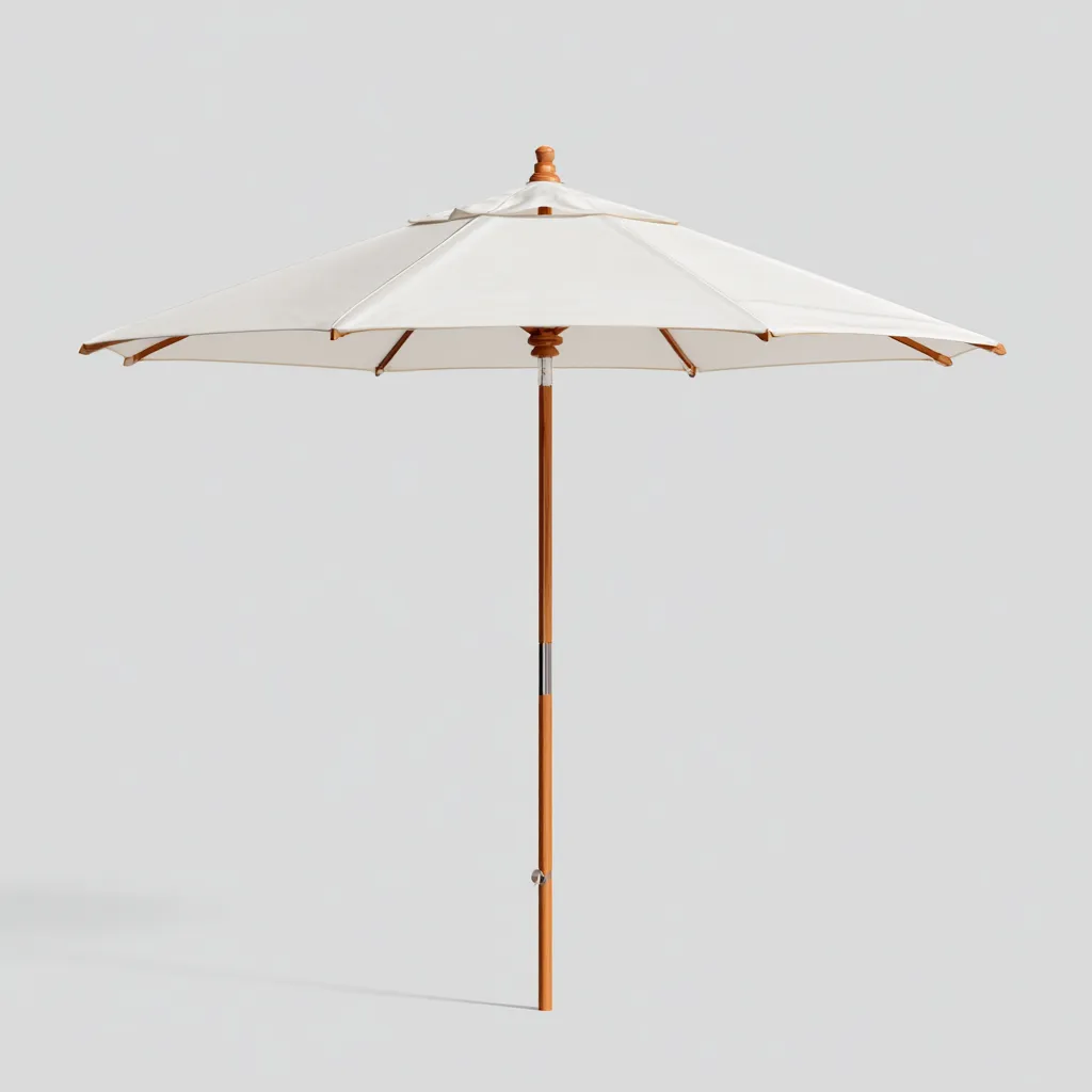 Ten elegancki parasol ogrodowy w kolorze białym z drewnianym trzonem to połączenie funkcjonalności i naturalnego stylu. Doskonale sprawdzi się w ogrodzie, na tarasie lub w przydomowej strefie relaksu, zapewniając cień i komfort w słoneczne dni.