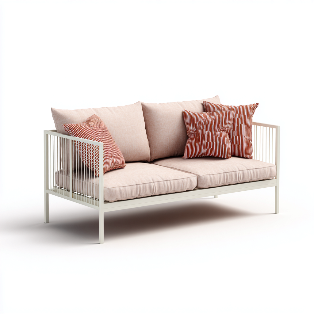 Nowoczesna sofa ogrodowa o lekkiej i eleganckiej konstrukcji łączy prostotę formy z wyjątkowym komfortem użytkowania. Jasnoróżowe poduszki na białej metalowej ramie tworzą harmonijny kontrast, nadając przestrzeni zewnętrznej świeżości i subtelnego uroku.