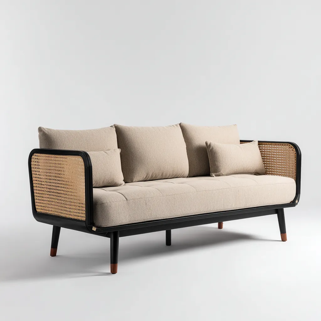Sofa została wykonana z wytrzymałego metalu malowanego proszkowo w kolorze czarnym, co zapewnia odporność na rdzę i warunki atmosferyczne. Boki wykonane z naturalnego rattanu wplecionego ręcznie dodają całości ciepłego, organicznego charakteru. Beżowe poduszki z tkaniny poliestrowej są miękkie, przyjemne w dotyku i łatwe do utrzymania w czystości.