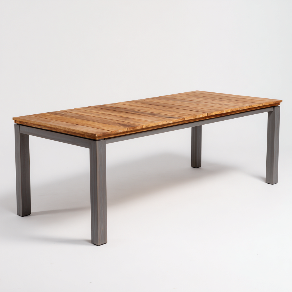 Ten elegancki prostokątny stół ogrodowy łączy naturalne piękno drewna tekowego z nowoczesnym wyglądem metalu. Idealny do ogrodu, na taras lub patio, tworzy komfortową przestrzeń do wspólnych posiłków na świeżym powietrzu.