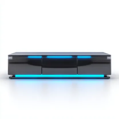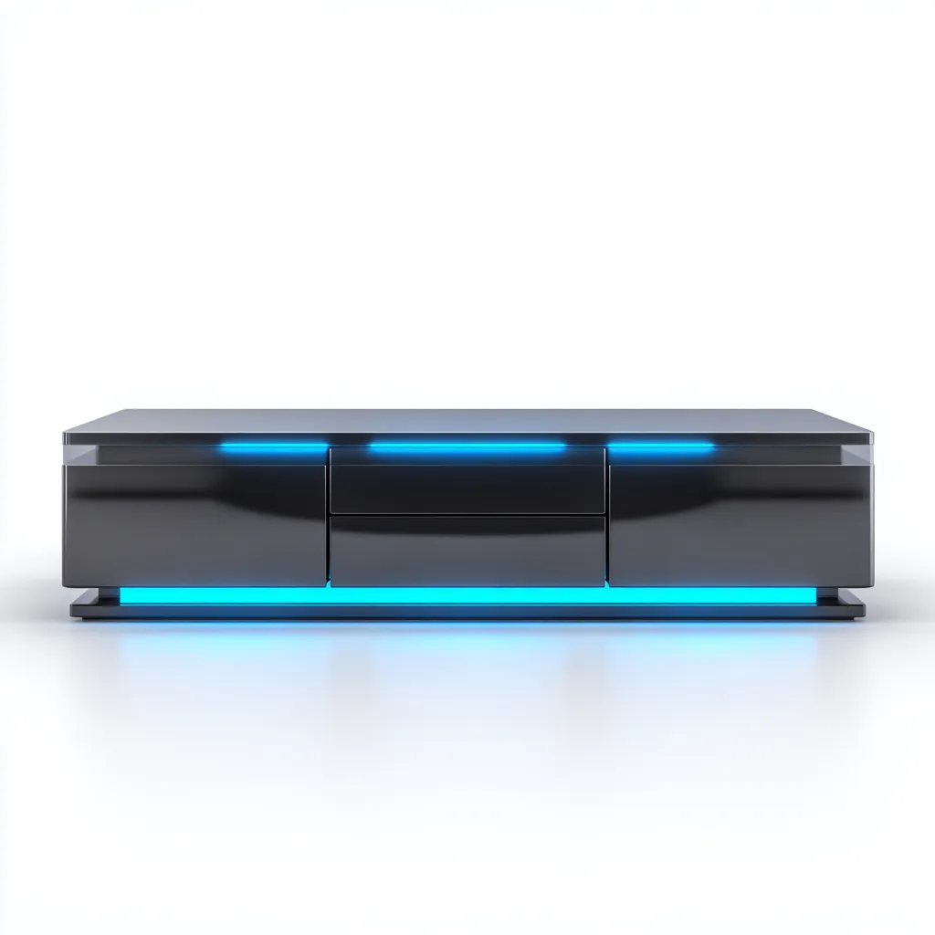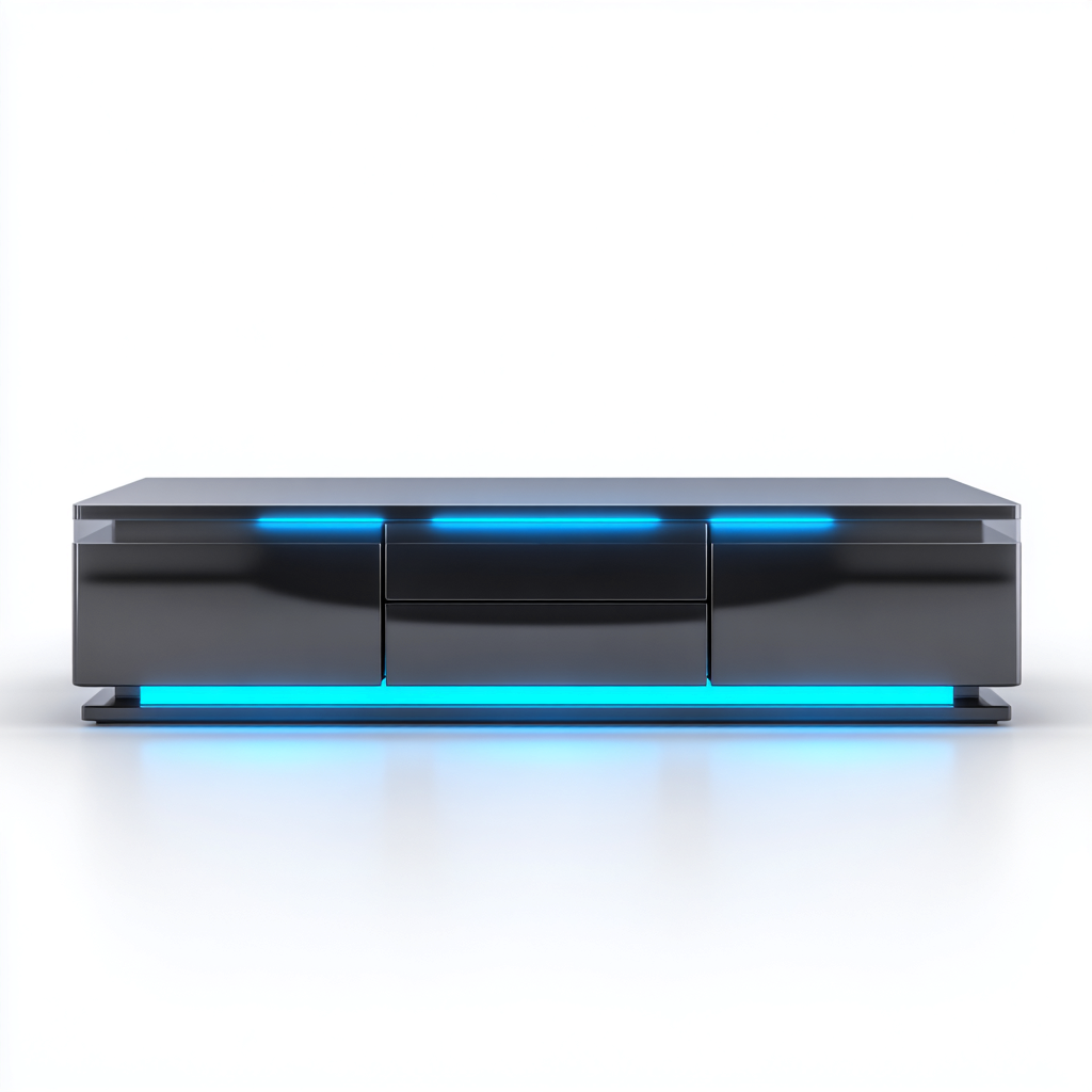 Nowoczesna szafka RTV w wysokim połysku z efektownym oświetleniem LED. Czarne wykończenie i futurystyczna linia nadają wnętrzu elegancji oraz nowoczesnego charakteru, idealnie komponując się z minimalistycznym wystrojem salonu.
