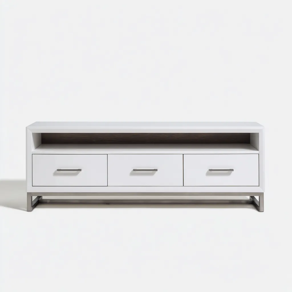 Szafka wyposażona w trzy pojemne szuflady oraz otwartą półkę, co umożliwia wygodne przechowywanie sprzętu RTV, akcesoriów i dekoracji. Jej minimalistyczna forma doskonale wpasowuje się w nowoczesne wnętrza.