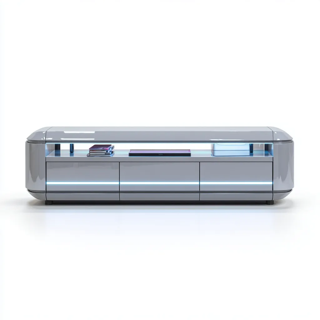 Nowoczesna szafka RTV o futurystycznym wyglądzie, wykonana z połączenia szkła i płyty meblowej w szarym połysku. Dzięki zaokrąglonym krawędziom i efektownemu oświetleniu LED nadaje wnętrzu wyjątkowy, nowoczesny charakter.