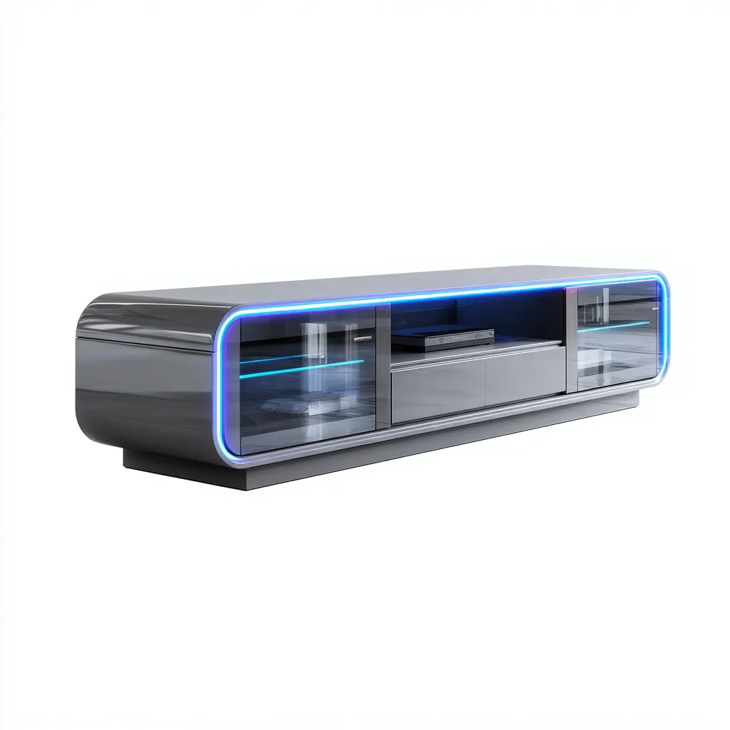 Model wyposażony w przeszklone przestrzenie i szuflady, oferując miejsce na sprzęt RTV, konsole lub dekoracje. Zintegrowane oświetlenie LED tworzy nastrojowe światło i dodaje wnętrzu futurystycznego akcentu.